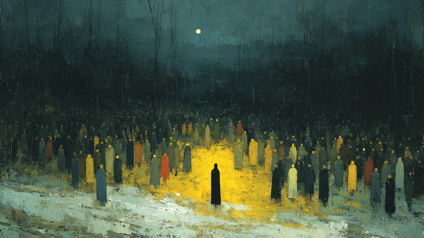 Figures gather in darkness, faces barely visible, waiting for something unnamed—a crowd scene that captures the tension of collective anticipation. The Assembly Waits channels the unsettling power of Goya's Black Paintings, where humanity masses in shadow and individual identity dissolves into crowd psychology. The ink and charcoal palette renders this gathering: deep blacks swallow the surrounding space, soft charcoals model the press of bodies, graphite grays suggest faces caught between light and shadow, while scattered illumination reveals fragments of expression—expectation, anxiety, resolve. This is the crowd as organism, the assembly as held breath before the moment breaks. Transform your Samsung Frame TV or HiSense CanvasTV into a window overlooking the assembly where darkness holds court and anticipation builds.