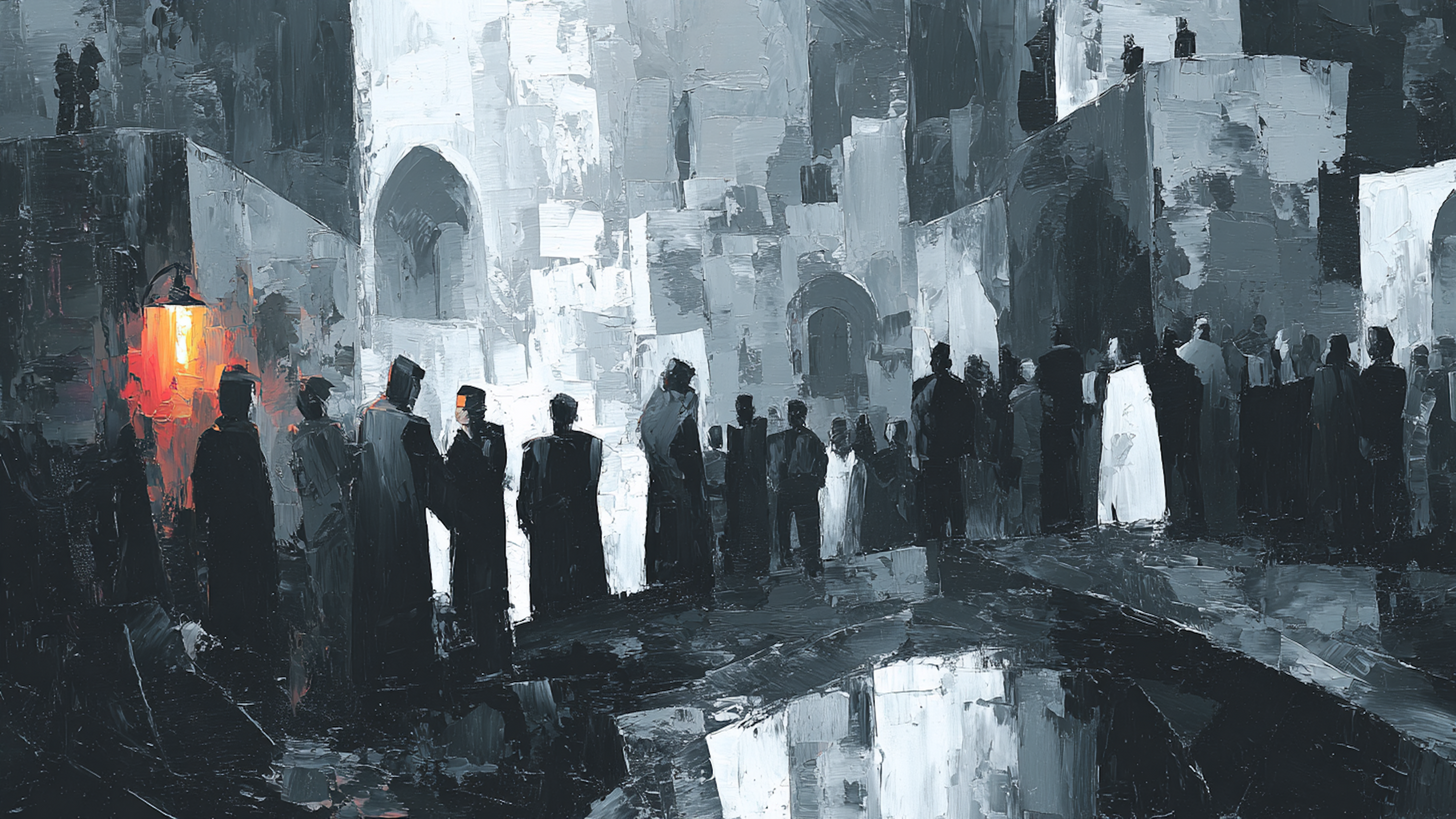 A single crimson glow punctuates the void—a lantern suspended in darkness where shadows swallow architecture and light becomes precious currency. The Red Lantern captures that particular poetry of illumination in abandoned spaces, where one warm beacon transforms emptiness into atmosphere and mystery into meditation. The ink and charcoal palette renders this brooding scene: deep blacks dominate the composition's edges and depths, soft charcoals suggest architectural fragments, graphite grays model distant surfaces catching ambient light, while the red lantern burns like a heart in the surrounding darkness. This is solitude made visible, the single light as both comfort and question. Transform your Samsung Frame TV or HiSense CanvasTV into a window overlooking the space where one lantern holds the darkness at bay.