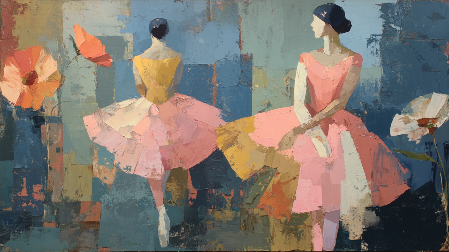 The prima ballerina descends in reverence as applause washes over her—that singular moment when performance ends and gratitude begins. The Final Bow captures ballet's most graceful ritual, the dancer's acknowledgment of the audience rendered in geometric abstraction. Her white tutu becomes a burst of light against the warm stage, her form bending in the universal gesture of artistic humility. Rose and coral tones suffuse the scene while teal shadows suggest the depths of the theater beyond. This is triumph made visible, the bow as meditation on the relationship between artist and audience.