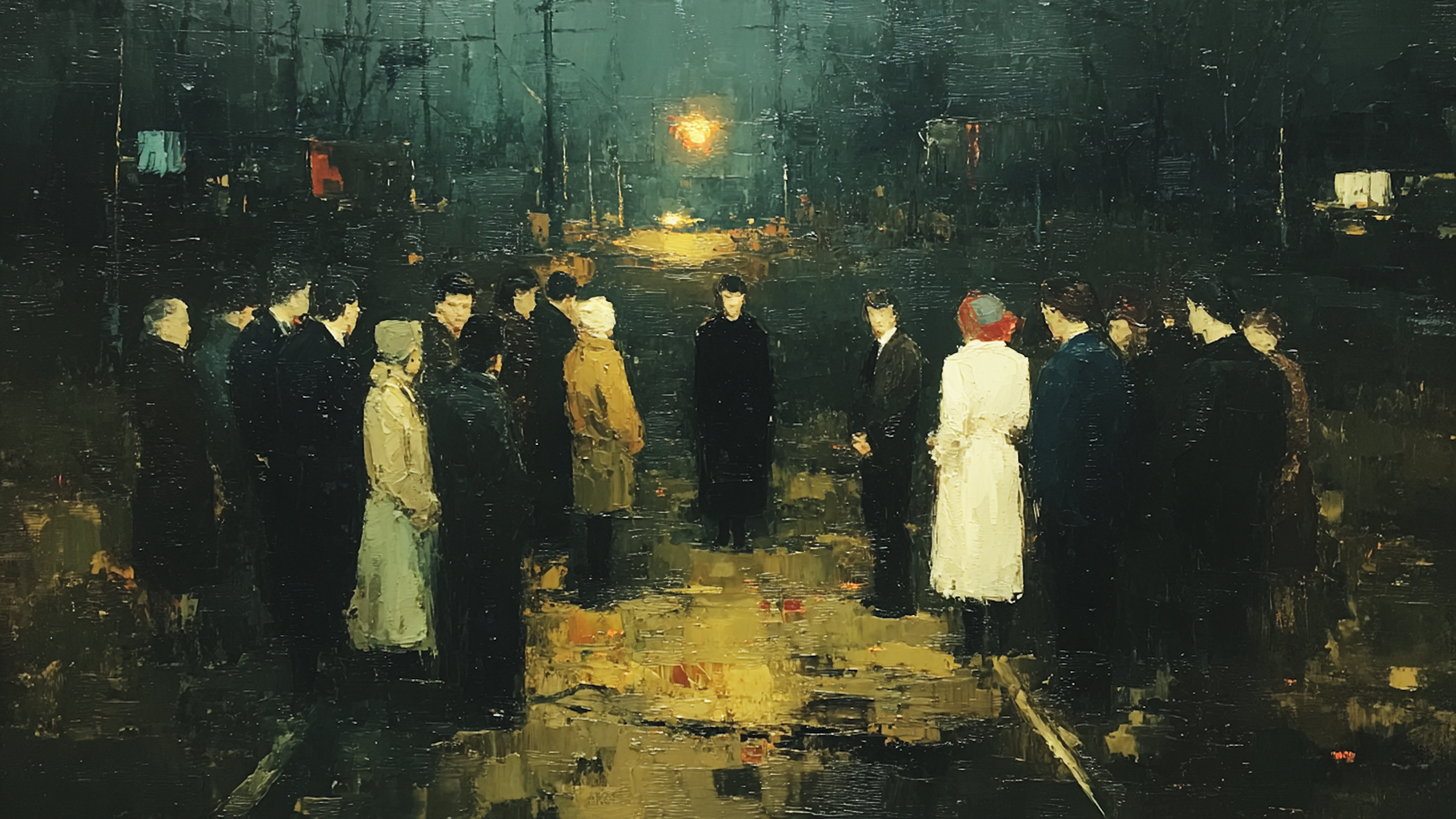 A: The scene deliberately maintains ambiguity—religious ceremony, political assembly, or something more mysterious. The uncertainty is part of the artistic power.