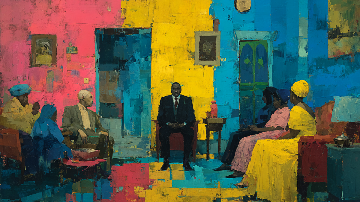 The lime green door commands the composition as relatives gather in the layered interior—family visiting captured in chromatic warmth. The Green Door celebrates the moment when the doorbell rings and familiar faces fill the room. Figures cluster in conversation while the bright door anchors the scene, a portal between outside and the intimate domestic space. Patterns accumulate across surfaces. The room holds generations, their presence felt in every layered detail.