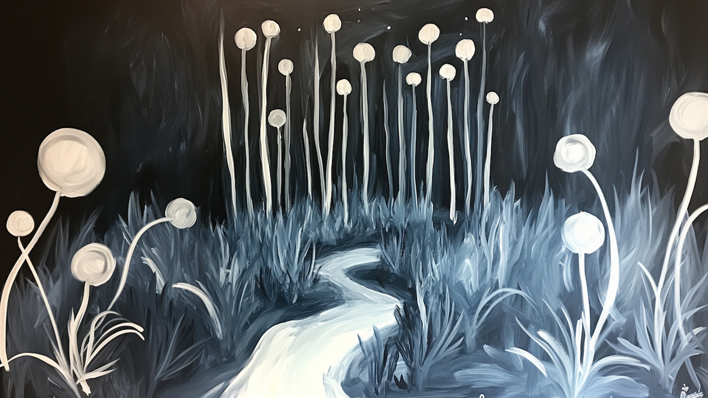 Glowpath traces a mysterious path through a forest of glowing orbs and shadowed grass. Painted in luminous monochrome, it evokes a sense of wonder and stillness—like walking through a nighttime dream or a myth from another world. Tall, delicate stalks stretch skyward, their tops pulsing softly like celestial lanterns.