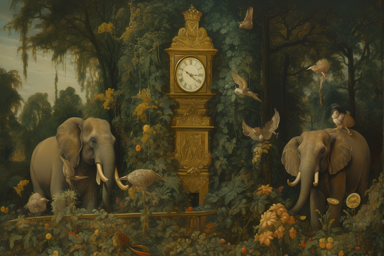 Enhance your space with Elephants Guarding Time, a captivating digital artwork designed for Samsung Frame TV, digital displays, and modern interiors. This surreal composition features majestic elephants standing as sentinels, guarding the ethereal realm of time, bringing a sense of grandeur and mystery to your display.