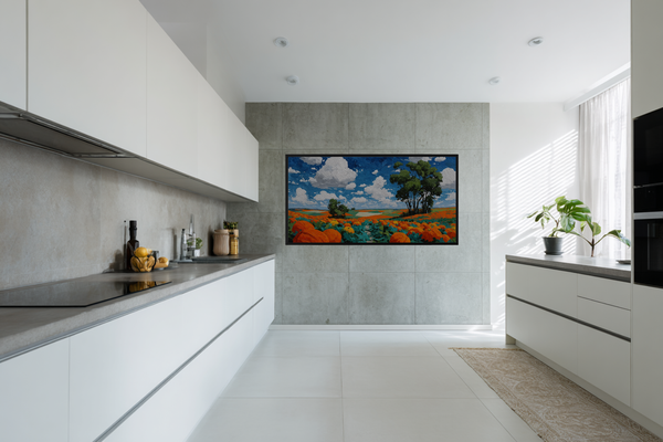 For your Samsung Frame TV or HiSense CanvasTV, this becomes a celebration of harvest season at its most visually dramatic. The composition employs classical landscape structure—foreground fields, middle-ground trees, background sky—but amplifies everything to emotional intensity. The orange and red-toned fields pulse with saturated warmth, the clouds dominate with architectural presence, and the overall effect feels less like documentation and more like agricultural landscape filtered through pure artistic enthusiasm.