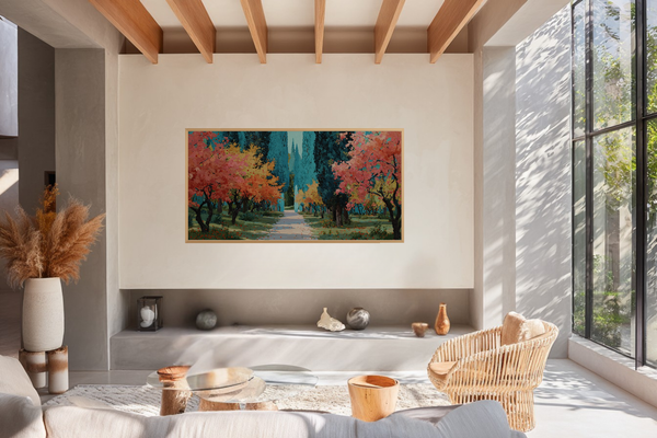 City parks in October hold a specific tranquility—the way autumn transforms urban green spaces into galleries of seasonal color, where morning joggers and afternoon strollers move through landscapes that glow with golden and coral light. Autumn Park Reverie captures this intersection of cultivation and seasonal wildness, a tree-lined park pathway where burnt oranges and soft corals create warm color harmonies beneath a sky that hints at morning mist. This painterly scene transforms your Samsung Frame TV or HiSense CanvasTV into a window onto those perfect autumn mornings when parks feel less like designed landscapes and more like natural sanctuaries that happen to exist within city limits.