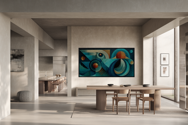This sophisticated geometric piece anchors mid-century modern and contemporary interiors with timeless appeal. Position your Frame TV as a statement piece above low-profile furniture or floating consoles. The ocean and sky blue palette pairs beautifully with warm wood tones, brass fixtures, and neutral textiles, while the geometric forms complement angular furniture and clean architectural lines.🏠 Complementary Art Pairings