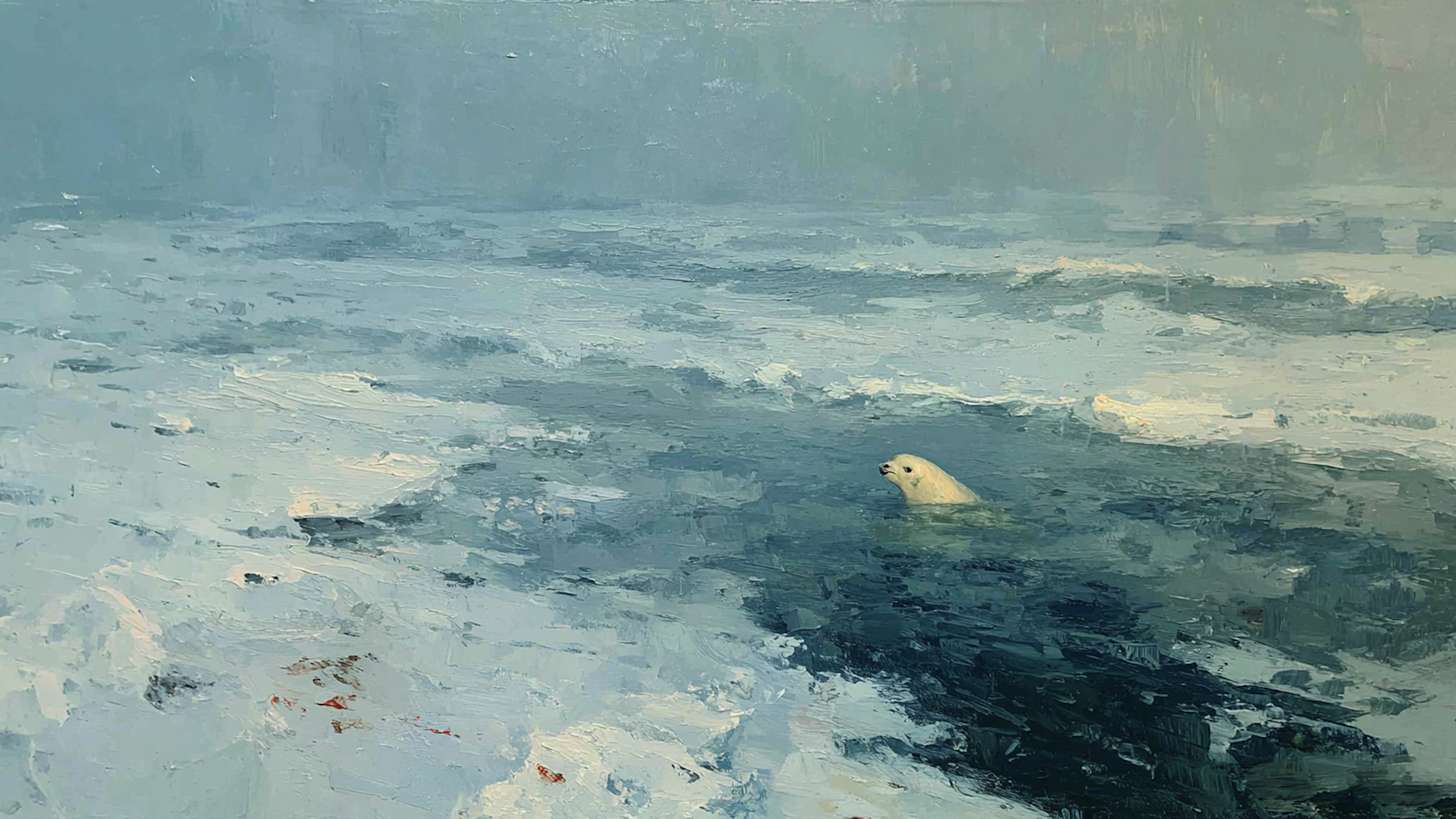The palette embraces the monochromatic north—soft gray of arctic waters, cream white of the beluga's distinctive skin, touches of sage where deeper water shows through the surface. The painterly technique captures the whale's unique silhouette with attention to the smooth curves that make belugas so recognizable while allowing the surrounding water to dissolve into impressionistic texture. Muted tones throughout create unity between creature and environment, the whale emerging from rather than contrasting against its habitat. The treatment transforms wildlife encounter into something approaching meditation, finding in this pale visitor the quiet mystery of polar seas.