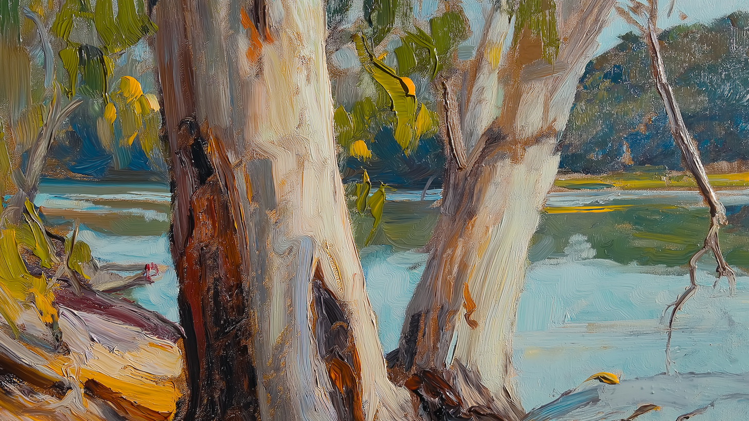 Beneath the Canopy captures a sunlit moment where tree trunks stretch skyward and light dances on a glassy riverbank. Thick painterly strokes bring bark and leaf to life, while the layered background pulls your eye into a hush of shaded greens and still water. It’s a study in texture and light—an ode to quiet observation.