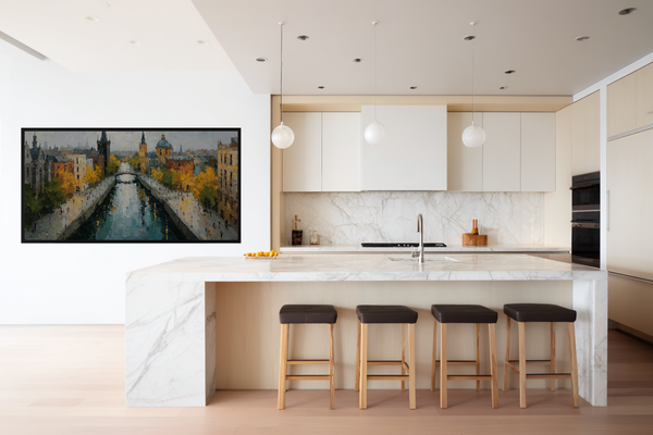 Optimized for 16:9 aspect ratio displays, this 4K canal landscape digital art transforms Samsung Frame TV and HiSense CanvasTV screens into European travel experiences. The horizontal composition with central vanishing point works especially well on larger displays, creating depth and invitation. Download includes a premium PNG file that requires no adjustment—instant upload, immediate display.
