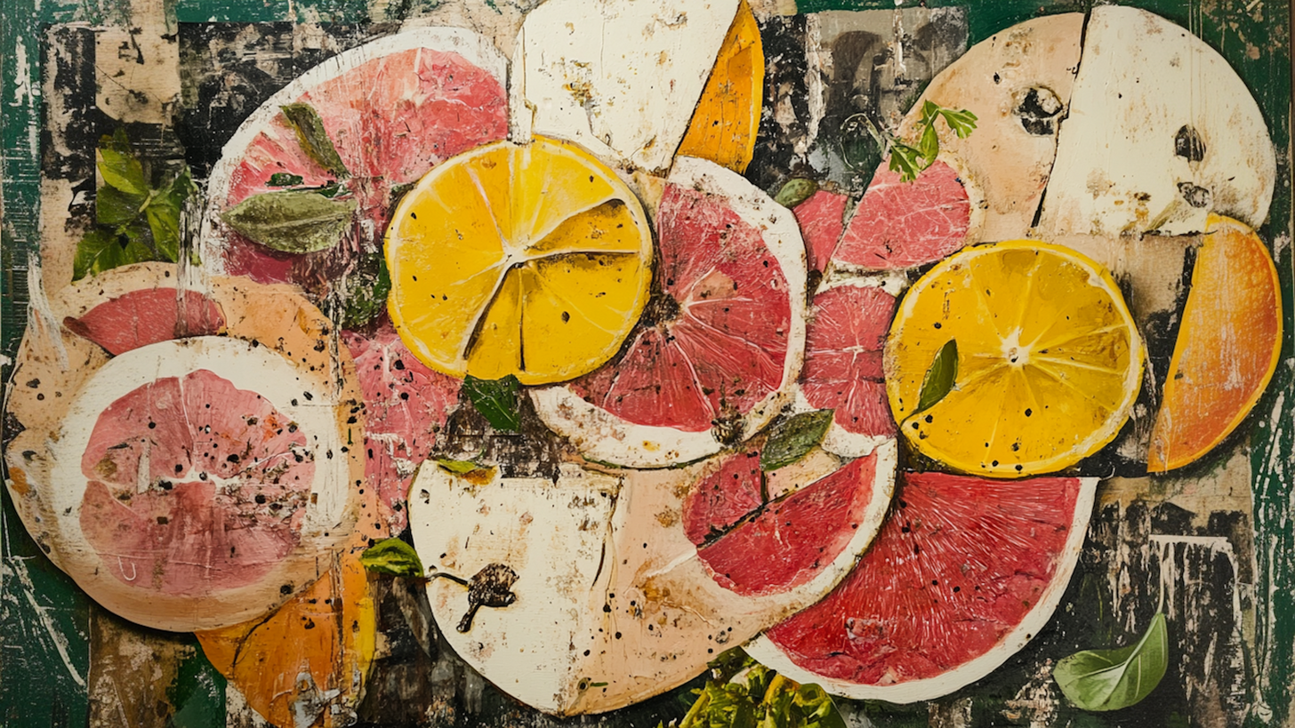 - Textural Fruit Layers – Grapefruit, lemon, and orange slices with painterly grit