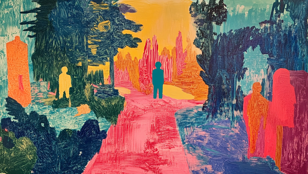 Cobalt Convergence employs a sophisticated jewel-and-velvet color palette, layering deep emeralds, sapphire blues, and rich purples to create depth and mystery. The artist's technique involves building up translucent glazes that allow underlying colors to shimmer through, creating an almost luminescent quality. The convergence of the three figures suggests themes of community, communication, and collective consciousness – rendered through bold, confident strokes that celebrate both individuality and unity.