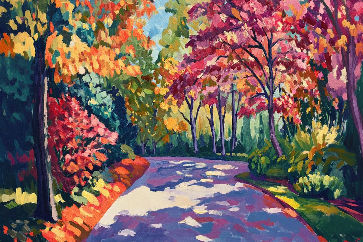 Crimson Walk captures a glowing autumn pathway where sun-dappled shadows spill across the winding road, and fiery foliage blazes in hues of crimson, amber, and gold. This digital impressionist landscape evokes the feeling of a crisp October morning, where every leaf feels painted by hand.