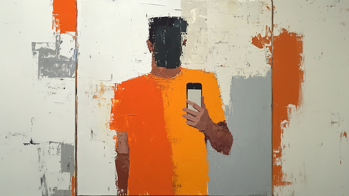 Echo in Orange strips portraiture down to its essentials—gesture, color, and silhouette. A faceless figure holds a smartphone, captured mid-selfie, rendered in palette knife swaths of pumpkin orange, steel gray, and raw white. The composition is silent yet loud, playful yet introspective—offering commentary on presence, technology, and anonymity in the digital age.