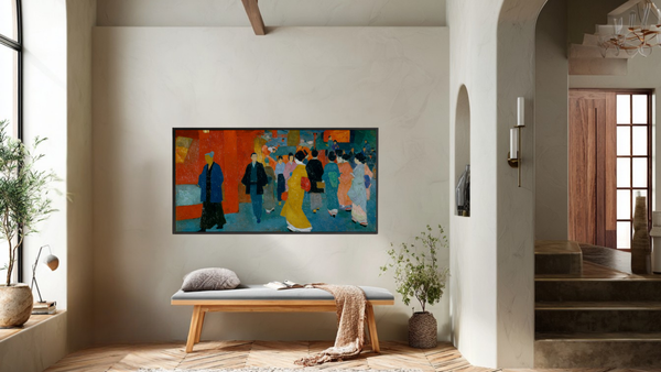 Optimized specifically for 16:9 aspect ratio displays, this 4K digital download ensures perfect presentation on your Samsung Frame TV or HiSense CanvasTV without any cropping or distortion. The artwork's horizontal composition works beautifully in landscape orientation, making it ideal for living rooms, dining areas, and open-plan spaces where the energy of gathering happens naturally.