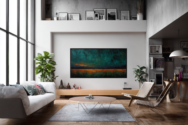 Will this green and gold landscape work with warm-toned decor? Absolutely! The golden field provides warm anchoring while the cool emerald sky creates beautiful balance, making it versatile for various color schemes. How does this minimal landscape display on different TV sizes? The simple, powerful composition scales beautifully—from intimate 43" displays where it feels like a window, to grand 75" installations where it becomes immersive. Is this abstract enough for modern minimalist interiors? Yes! The color field approach and simplified forms make it perfect for minimalist spaces while still providing natural warmth and connection. Learn more about optimizing your display settings in the official Samsung Frame TV Art Mode guide.What's included