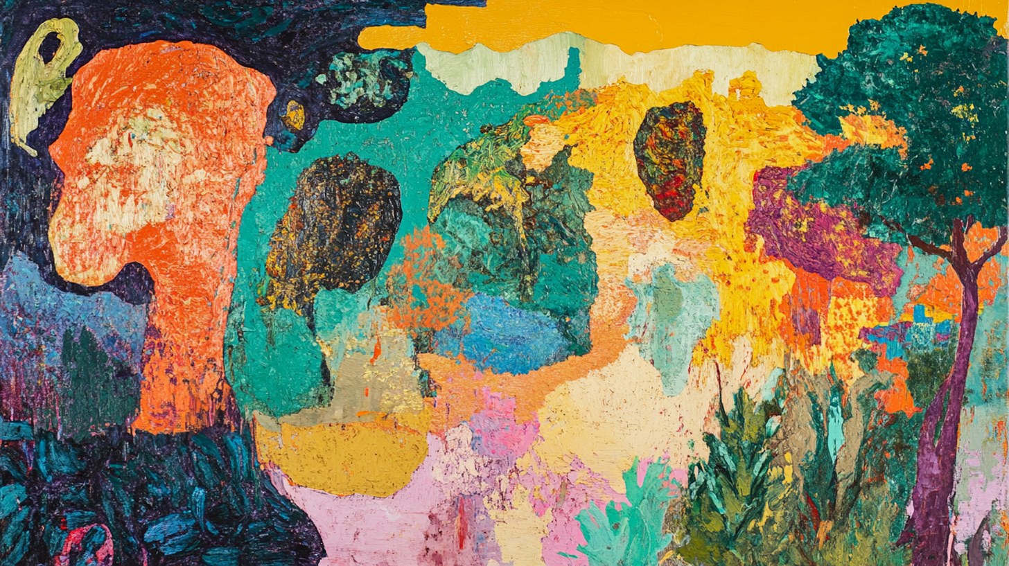 The technique references mid-century abstract expressionism while incorporating contemporary digital painting methods. Each shape is carefully considered for its relationship to neighboring forms, creating an organic unity that feels discovered rather than designed.