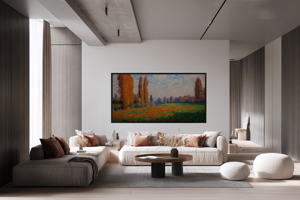 The atmospheric treatment prevents this from feeling too literal or documentary—it's recognizable as autumn grove but rendered with artistic softness that adds sophistication. Pair with soft textiles, natural materials, warm lighting. The mist element creates visual depth especially effective in smaller rooms where you want suggestion of expansive landscape beyond walls. Consider year-round display as reminder of nature's peaceful moments, or seasonal rotation emphasizing autumn's contemplative beauty.