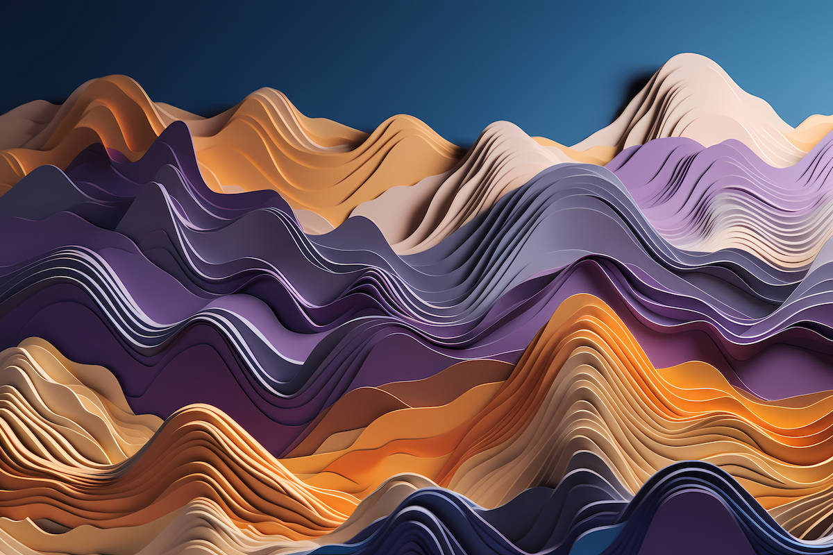 Immerse yourself in the flowing beauty of Layered Horizons, a sculptural digital artwork that features fluid, undulating forms in warm ochres, deep purples, and soft neutrals. This abstract composition captures the essence of geological landscapes and organic movement, creating a striking visual depth.
