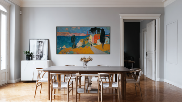 Perfectly optimized for 16:9 aspect ratio displays, this 4K digital download ensures exceptional clarity on Samsung Frame TV and HiSense CanvasTV screens. The warm Mediterranean palette displays beautifully on QLED technology, with the terracotta and amber tones particularly vibrant. Compatible with all Frame TV models from 32" to 85", maintaining perfect resolution across all sizes.