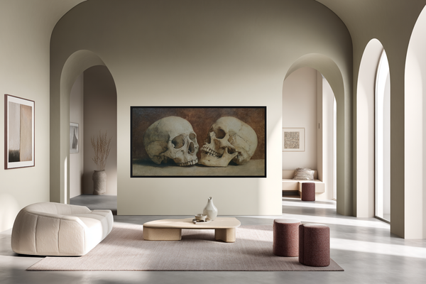 Two human skulls face each other in silent conversation across time, rendered with exquisite anatomical precision against a neutral backdrop that suggests both museum display case and artist's studio. Memento Mori Dialogue brings the classical tradition of vanitas imagery into contemporary interiors, transforming your Samsung Frame TV or HiSense CanvasTV into a meditation on mortality that manages to be both beautiful and contemplative rather than morbid. This isn't Halloween kitsch—it's art historical reference rendered with museum-quality detail. The skulls appear almost affectionate in their positioning, turned toward each other as if engaged in eternal dialogue. The stone and linen color palette creates an atmosphere of scholarly contemplation, invoking the aesthetic of natural history collections and Renaissance painting studios where such objects served as tools for understanding human form.Why Choose This Anatomical Art Digital Artwork
