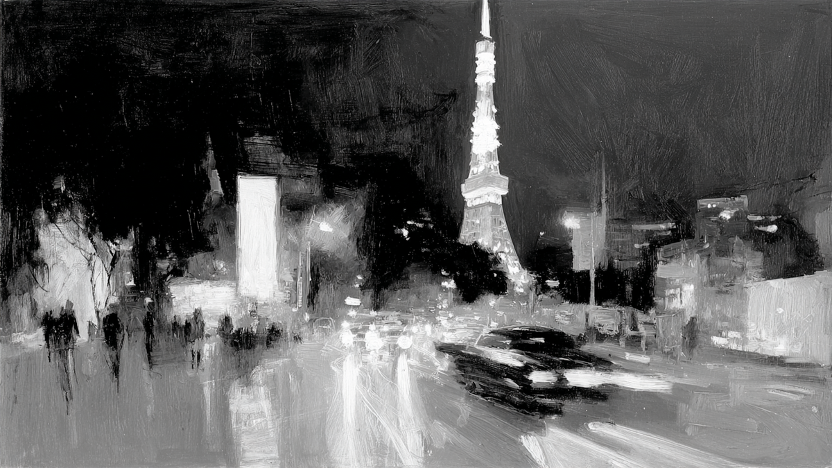 The palette celebrates urban elegance through restraint—deep blacks define shadows and vehicle forms, soft charcoals suggest wet pavement reflecting city lights, graphite grays create atmospheric depth. Strategic touches of taxi yellow and traffic light colors punctuate the monochrome composition like accent notes in a jazz arrangement, drawing the eye through the scene's natural flow.