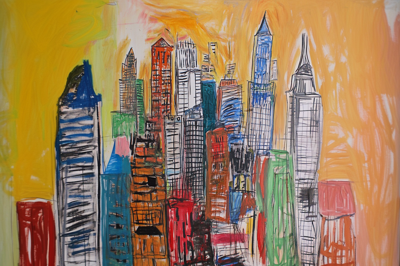 Skyscrapers rise in vibrant shades of green, red, yellow, and blue—anchored by a central tall building—against white and yellow backgrounds. The composition captures the charm of urban doodles and colorful childlike sketches, perfect for creating a modern and joyful focal point in your space.