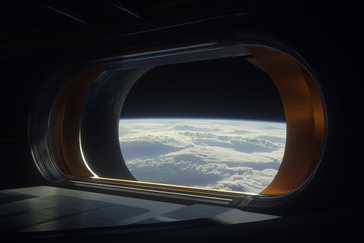 Experience Earth from above with Orbit View, a cinematic-style artwork that captures a serene view of the planet from a spacecraft window. This high-resolution piece brings a calming, science fiction-inspired ambiance to your space.