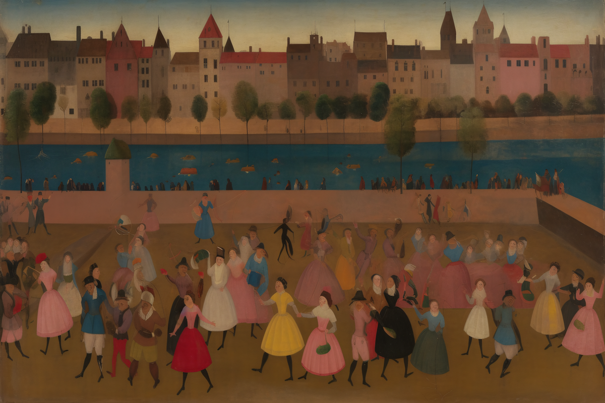Parisian Revelry captures the joy and energy of a lively dance scene along the River Seine. Inspired by the expressive styles of Jean Metzinger, Henry Darger, and Jean Renoir, this vibrant artwork depicts people in flowing, colorful dresses moving to the rhythm of celebration, set against a backdrop of Parisian buildings and canals.