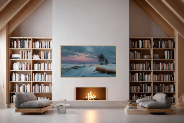 In this ethereal winter landscape, dawn breaks in whispers of blush and mauve across an endless meadow, where a solitary tree stands witness to the day's quiet birth. The scene captures that magical moment when pink and lavender light transforms snow into rose-tinted silk, while soft mauves deepen in the distant hills. This dreamlike digital artwork uses the subtlest gradations of the blush and mauve palette to create a meditation on light and space. Transform your Samsung Frame TV or HiSense CanvasTV into a window onto this gentle awakening.Why Choose This Dawn Meadow Digital Artwork