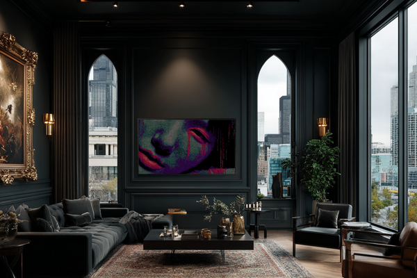 Engineered for Samsung Frame TV and HiSense CanvasTV displays, this 16:9 artwork creates fascinating conceptual resonance—a piece about digital image corruption displayed on digital screens. The high contrast between deep jewel tones and neon glitch elements showcases your display's full color gamut. The 4K resolution paradoxically emphasizes both the portrait's underlying detail and its intentional degradation, creating visual tension that rewards close examination. This is art that understands and celebrates its digital medium.Perfect For Your Contemporary Interior