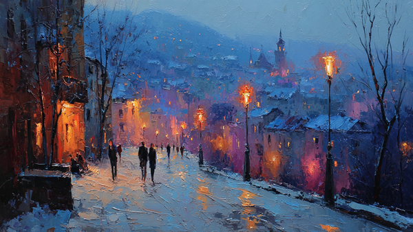 The amber glow of street lamps reflects on wet cobblestones as twilight descends on this enchanting European street scene, where figures with umbrellas navigate between historic buildings dusted with snow. This atmospheric digital artwork captures that magical hour when warm terracotta light from windows and vintage lampposts battles the deep blue of winter evening, creating a symphony of amber and terracotta tones against cool shadows. The impressionistic brushwork transforms your Samsung Frame TV or HiSense CanvasTV into a window overlooking a romantic European winter, where every puddle becomes a mirror for golden light.Why Choose This European Street Digital Artwork