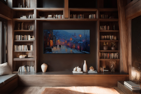 Q: Will the amber tones work with cool-toned decor? A: The warm street lights create beautiful contrast against cool interiors, adding warmth without clashing with blue or gray color schemes. Q: Is this suitable for a bedroom? A: Absolutely! The peaceful evening scene and warm lighting create a calming atmosphere perfect for bedroom settings. Q: How does this look in bright daylight? A: The high contrast between lights and shadows ensures the image remains impactful even in bright rooms, though it truly shines in softer lighting. Learn more about optimizing evening scenes at Samsung's Frame TV Art Mode guide.Compatibility Details