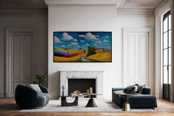 Formatted specifically for 16:9 aspect ratio screens, this 4K agricultural tapestry digital art maximizes your Samsung Frame TV or HiSense CanvasTV's display capabilities. The rolling composition takes full advantage of widescreen formats, creating expansive panoramic feeling. Download includes a premium PNG file that displays perfectly without any adjustment—from 55-inch bedroom installations to 85-inch living room statements, the artwork scales flawlessly.