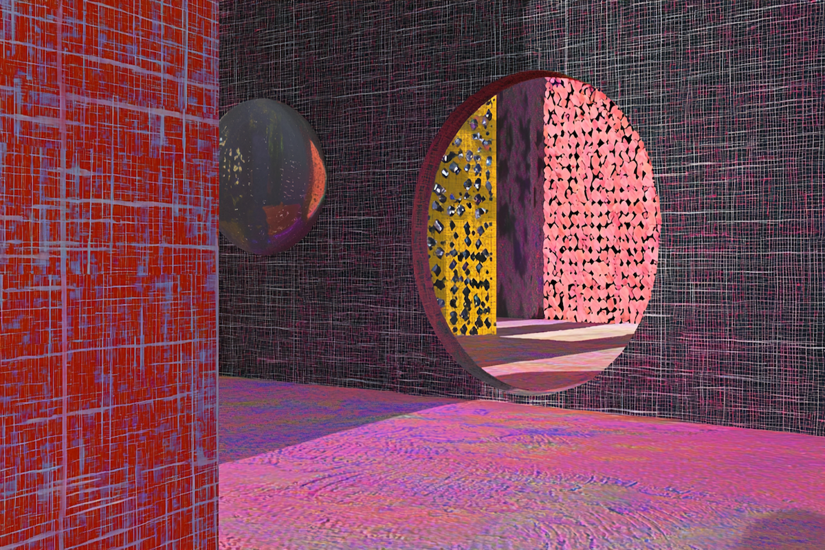 Surreal Interior Portal is a visually stunning psychedelic 3D artwork that reimagines architectural space with bold colors and surreal design. Inspired by Cinema 4D and the dreamlike aesthetics of Nate Perry, this piece features patterned red and pink fabric walls, an oval window glowing with yellow and black patterns, and a large circular opening leading to another dimension. The result is a mesmerizing fusion of digital surrealism and futuristic interior design.