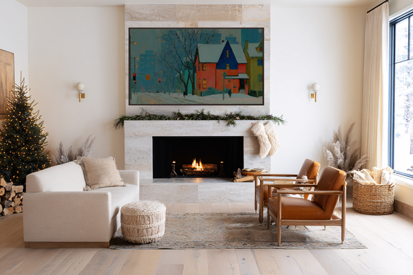 This architectural study celebrates Toronto's distinctive Victorian row houses found in neighborhoods like Cabbagetown and the Annex, employing a folk art sensibility with sophisticated color theory. The artist mixes warm amber and terracotta tones with cool sage and eucalyptus accents, capturing the playful spirit of Toronto's painted heritage homes. The technique simplifies Victorian gingerbread details into geometric patterns while maintaining each house's distinctive Toronto character. The bare tree, reminiscent of Toronto's urban canopy, acts as a graphic element unifying the composition.📐 Frame TV & CanvasTV Compatibility