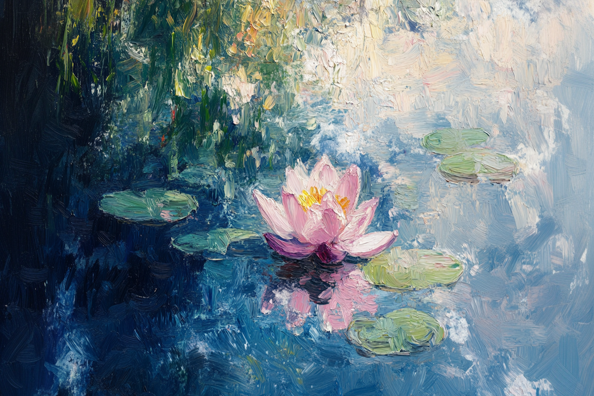 Tranquil Lily is a breathtaking digital artwork that pays homage to the delicate beauty of water lilies, inspired by the Impressionist master Claude Monet. This serene composition captures the timeless elegance of a pink water lily floating on a shimmering blue pond, surrounded by soft green leaves and gentle ripples.