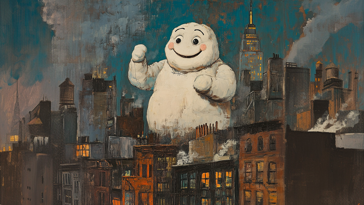 Urban Encounter brings playful chaos to the skyline, blending storybook whimsy with gritty brushstrokes and moody lighting. A familiar oversized figure grins through the steam of a mid-century city, surrounded by brick facades, glowing windows, and smoky rooftops. The result is part parody, part urban fairytale, and all personality.