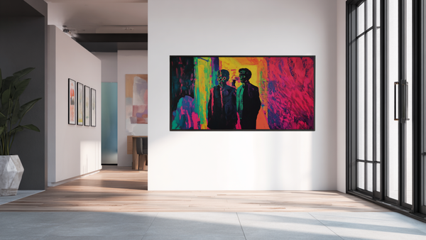 Step into a world where shadows dance with jewel tones, where midnight conversations unfold against walls of amethyst and ruby. Velvet Gathering captures that electric moment when strangers become silhouettes against the rich tapestry of an evening soirée. Deep purples and magentas create an atmosphere of sophisticated mystery, while the dark figures ground the composition in elegant restraint. This is art that whispers secrets, that transforms your Samsung Frame TV or HiSense CanvasTV into a portal to those velvet-draped salons where art and life intertwine.